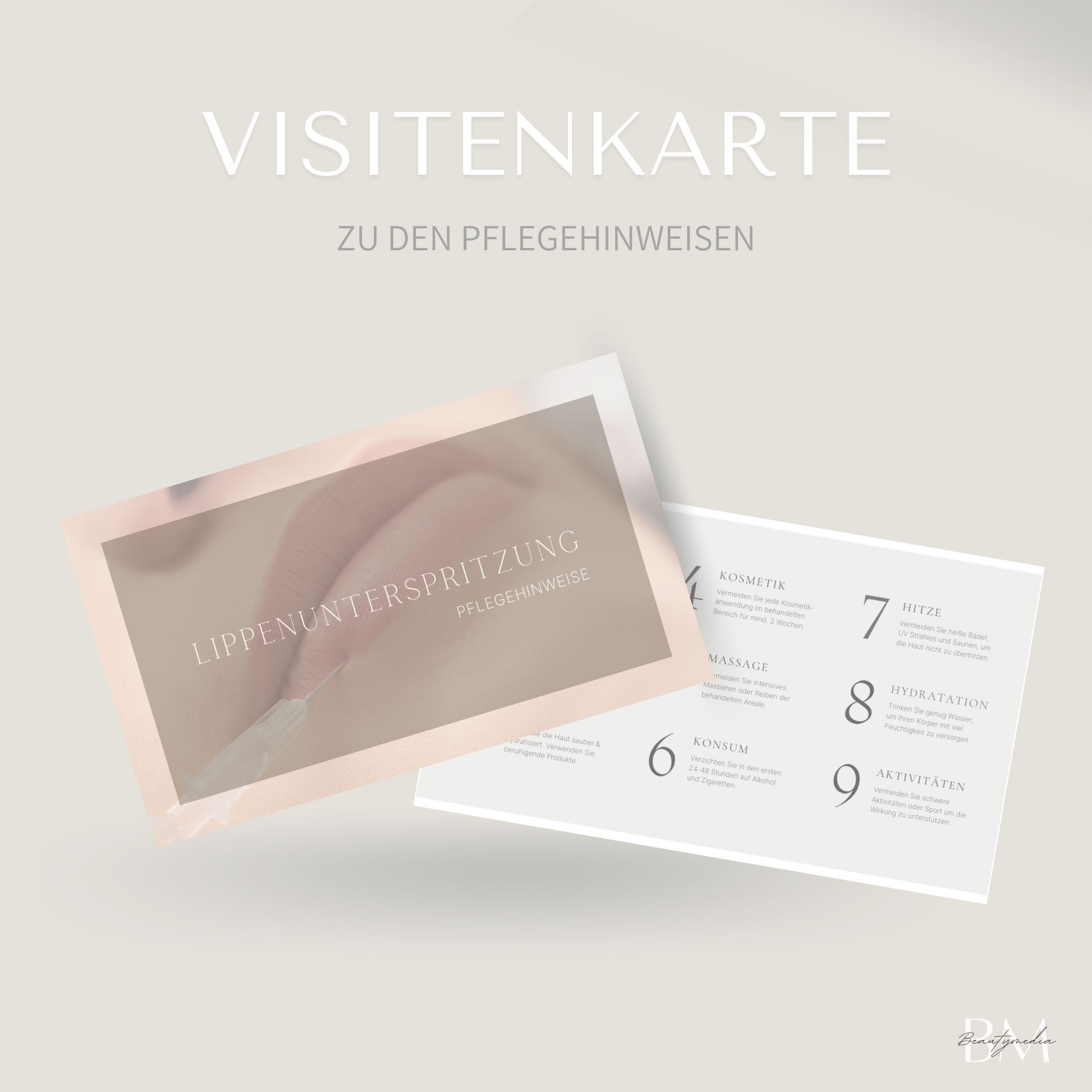 Es richtet sich an Fachanwenderinnen, Kosmetikerinnen sowie Studios, die Lippenunterspritzungen professionell anbieten und ihren Kundinnen eine klare sowie gut verständliche Nachsorge an die Hand geben möchten.