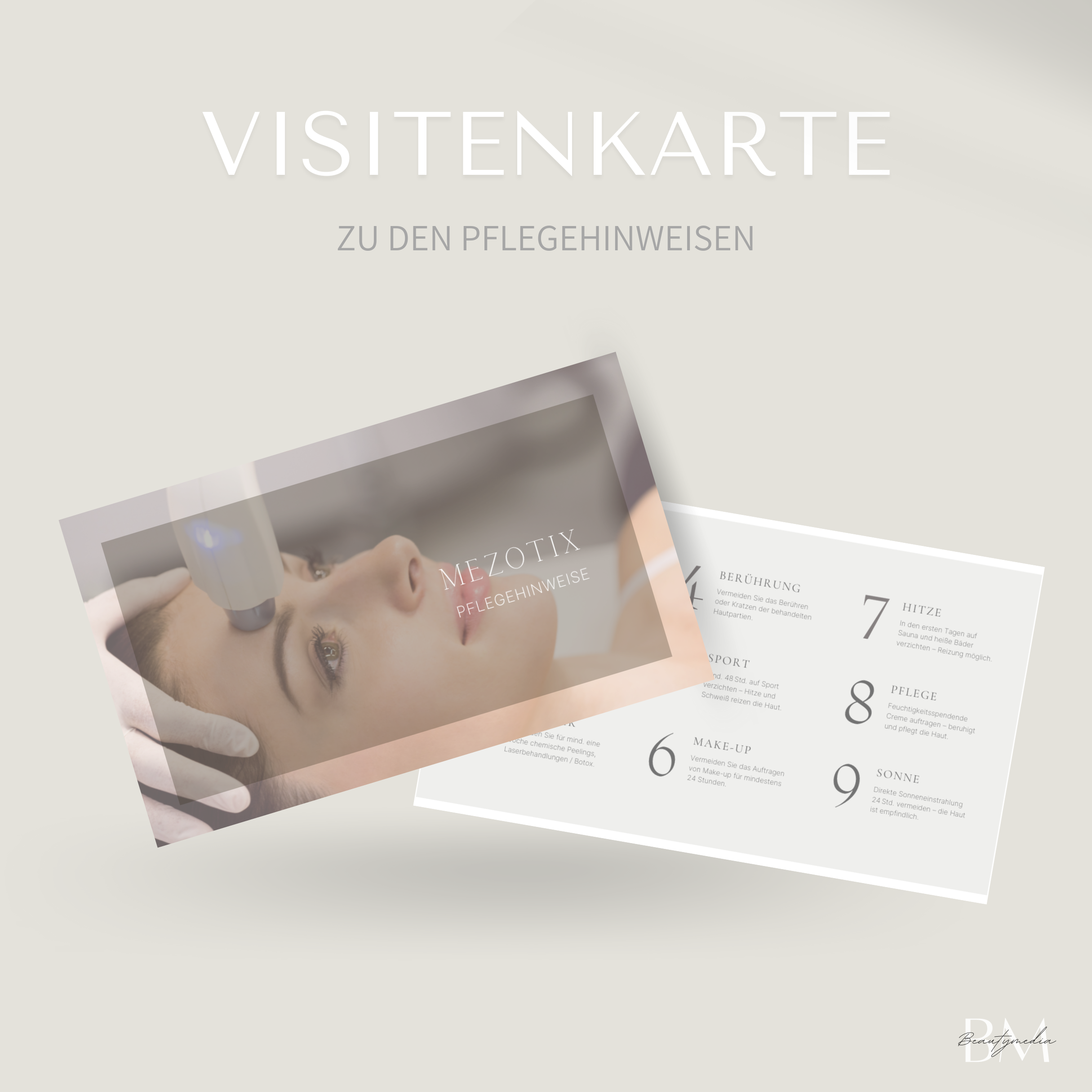 Es richtet sich an Fachanwenderinnen, Kosmetikerinnen sowie Studios, die Mezotix-Behandlungen professionell anbieten und ihren Kundinnen eine klare sowie gut verständliche Nachsorge an die Hand geben möchten.