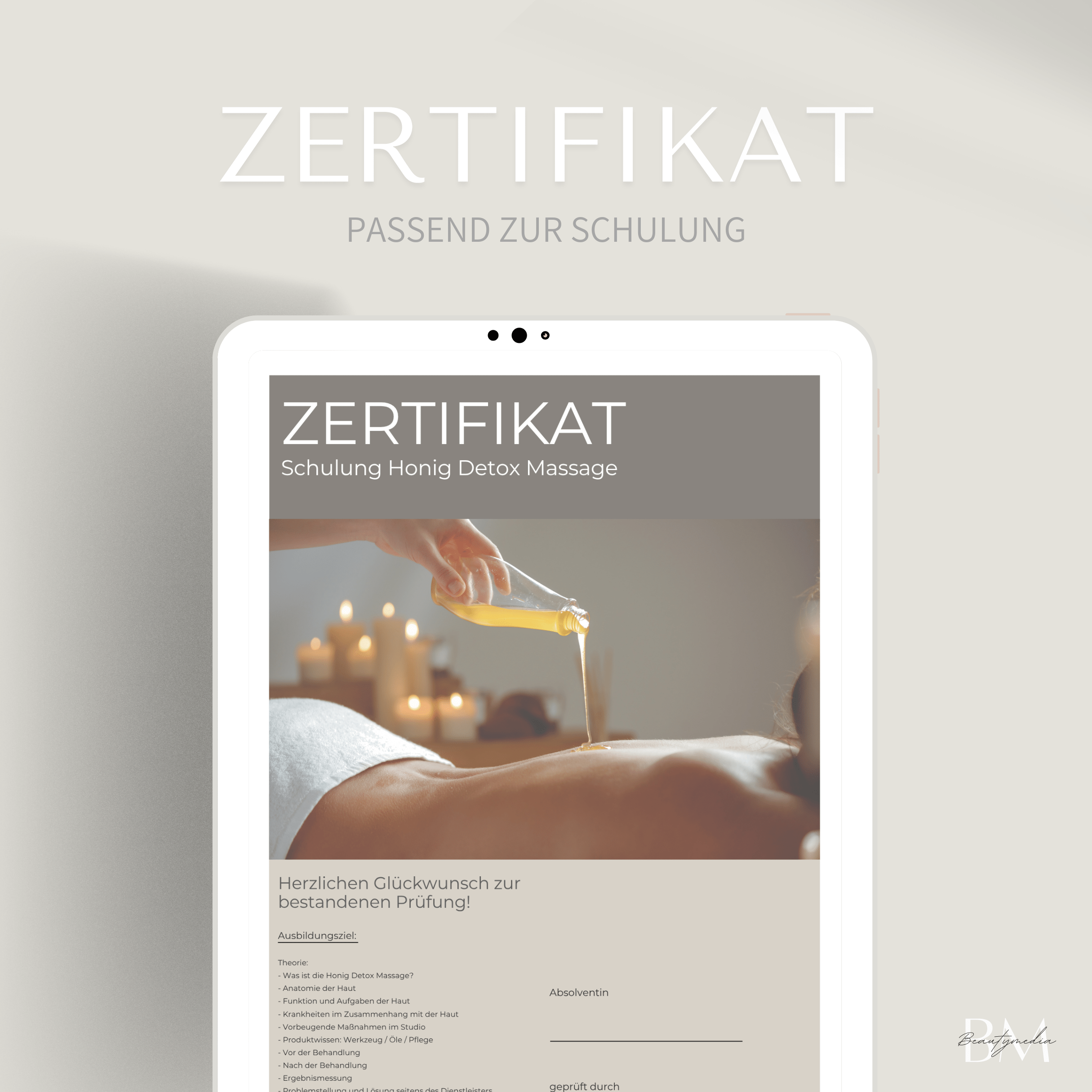 Laden Sie jetzt Ihr Zertifikat für Honig Detox Massage herunter und runden Sie Ihre Schulung mit einem professionellen Abschlussdokument ab. Entdecken Sie auch weitere passende Vorlagen in unserem Beautymedia Onlineshop.